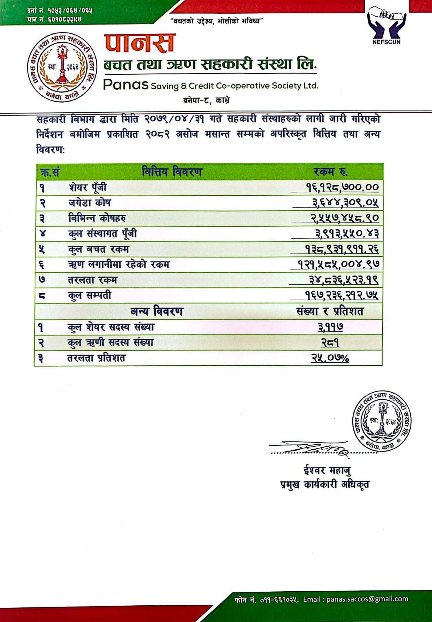 आदरणीय शेयर सदस्यज्युहरु, यस पानस बचत तथा ऋण सहकारी संस्था लि. लाई माया, साथ, सहयोग र विश्वास गर्नु भएकोमा म यस संस्थाको अध्यक्षको तर्फबाट र संचालक समितिको तर्फबाट हार्दिक आभार व्यक्त्त...