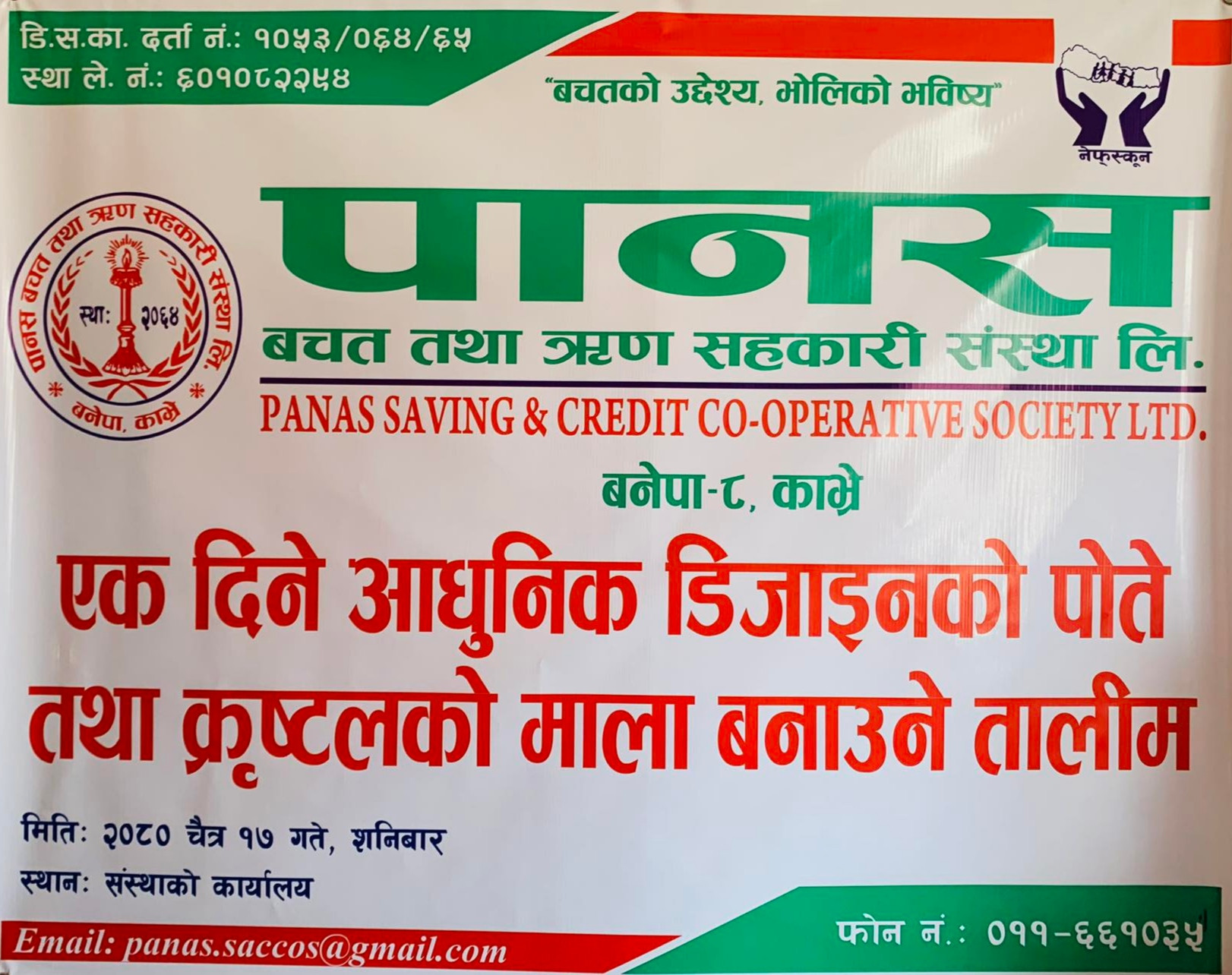 पानस बचत तथा ऋण सहकारी संस्था लि. बनेपा(०८, kavre एक दिने आधुुनिक डिजाइनको पोते तथा क्रिष्टलको माला बनाउने तालिम मिति २०८०÷१२÷१७ गते शनिबार को दिन पानस साकोस बनेपा ०८ मा एकदिने आधुनिक डिजाइनको पोते तथा क्रृष्टलको माला बनाउने तालिम सम्पन्न गरियो । यस तालिममा पानस साकोस को अध्यक्ष सुशन राजवंशी को अध्यक्षता...